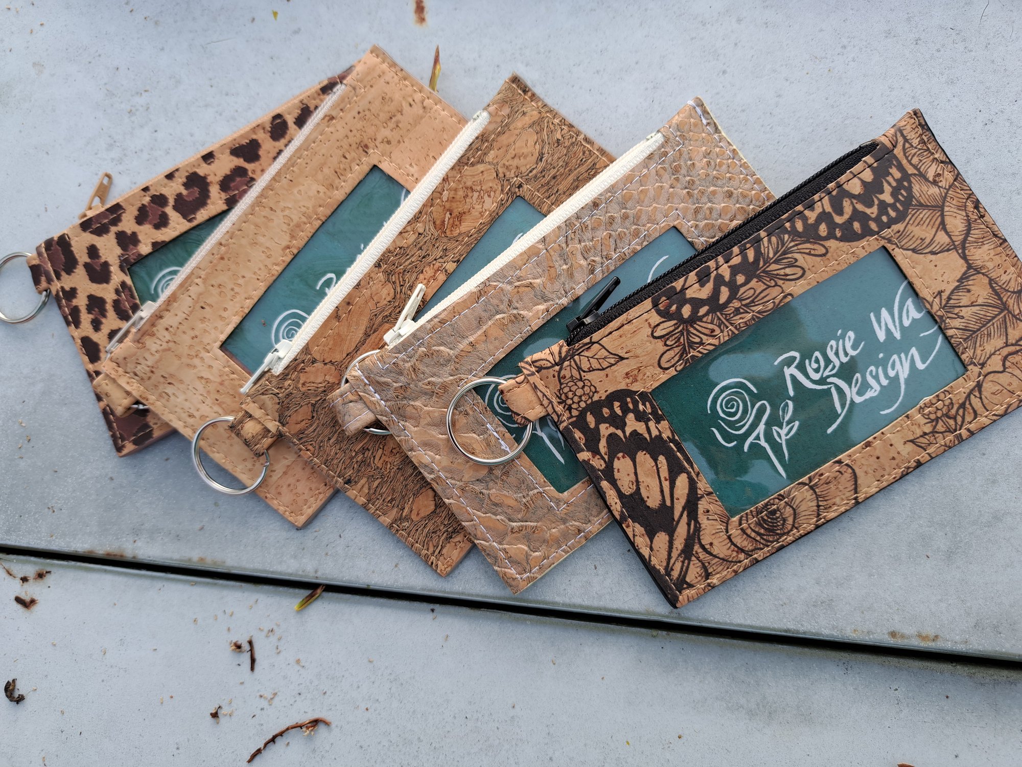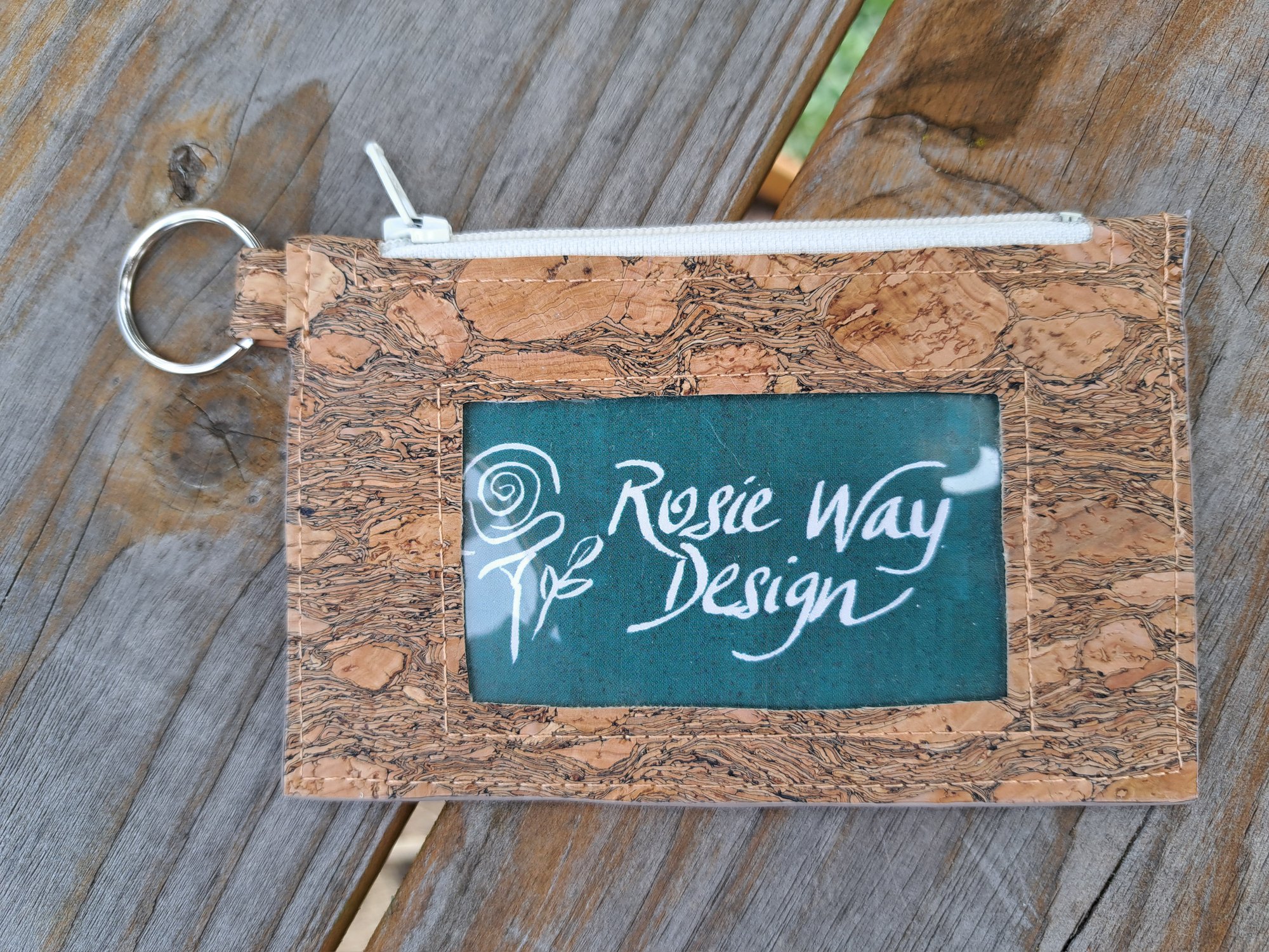 This simple wallet is perfect for just the essentials. It has a coordinating YKK zipper closure so everything is secure. There's a clear vinyl outside pocket and inner matching cork divider. You can fit more than expected since cork stretches with use (I've had 18 cards in mine, two wallet-sized pictures, bandaids, and more). A key ring on the outside is great for keys or clipping this to a belt or something else.