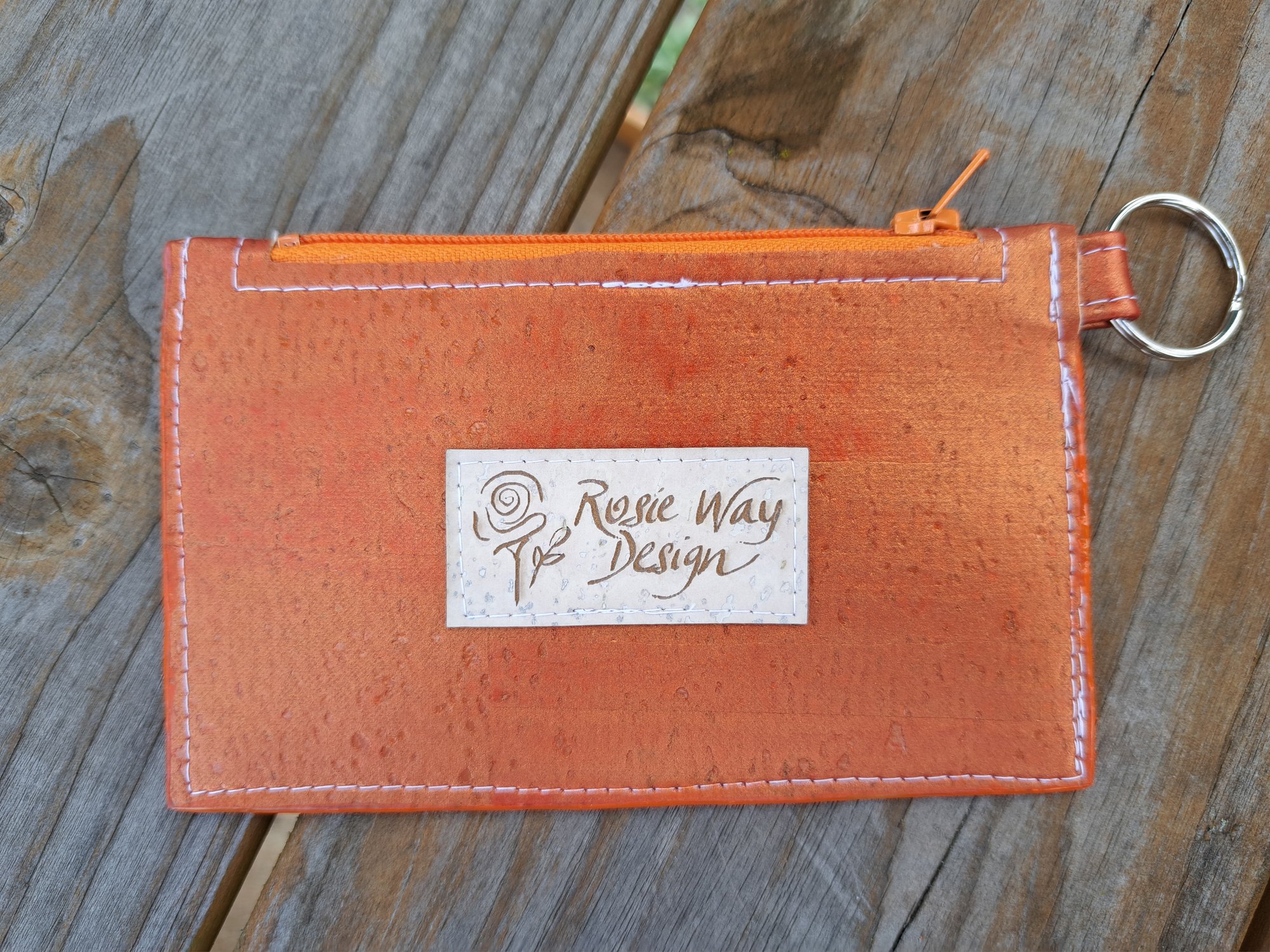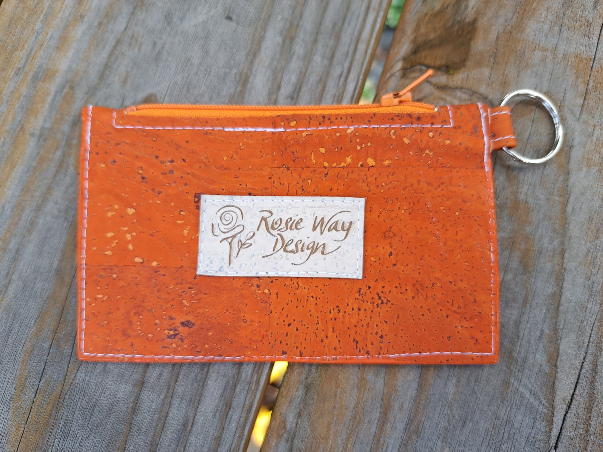 This simple wallet is perfect for just the essentials. It has a coordinating YKK zipper closure so everything is secure. There's a clear vinyl outside pocket and inner matching cork divider. You can fit more than expected since cork stretches with use (I've had 18 cards in mine, two wallet-sized pictures, bandaids, and more). A key ring on the outside is great for keys or clipping this to a belt or something else.