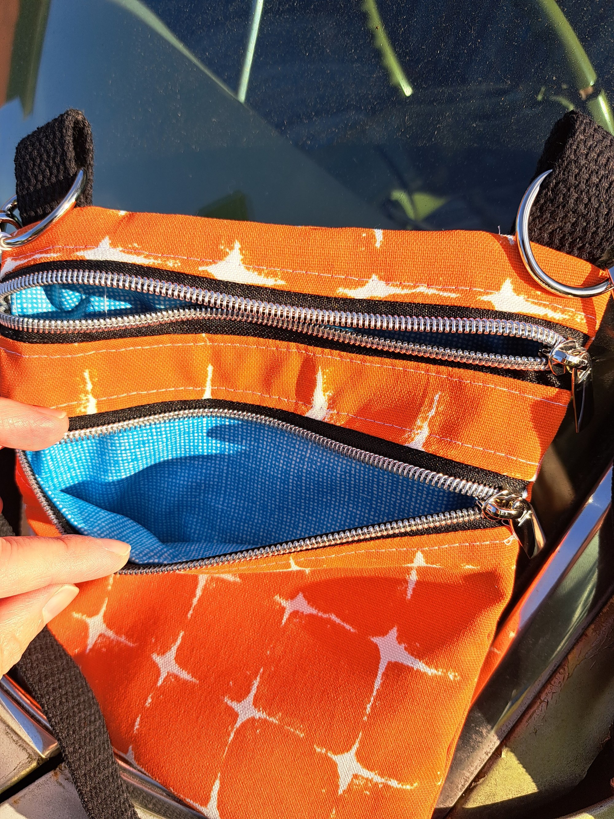 This bright orange bag features durable canvas fabric and an approximately 52" adjustable black cotton canvas strap. Zippers are black with nickel teeth, pulls, and hardware. The interior is a lovely blue water resistant cotton laminate fabric that's easily wiped clean but technically this could be machine washed.